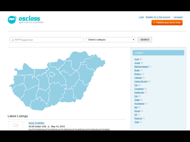 Simple, ready-to-use and customisable map theme of Hungary. This free theme is ideal if you want to make it easier for your users to find products and services in their own state, region or city. It will allow users to classify and filter their ads according to geolocation in Hungary. On this theme settings you can set which regions are your users selling products and services. From your admin panel, you can easily assign regions to your map. Remember that you must assign map regions prior to allowing users to post their ads. Do you need to customize it? All our themes allow you to add widgets both on the header and the footer section. Besides, this theme allows ad display, so you can earn money with your Osclass website!
